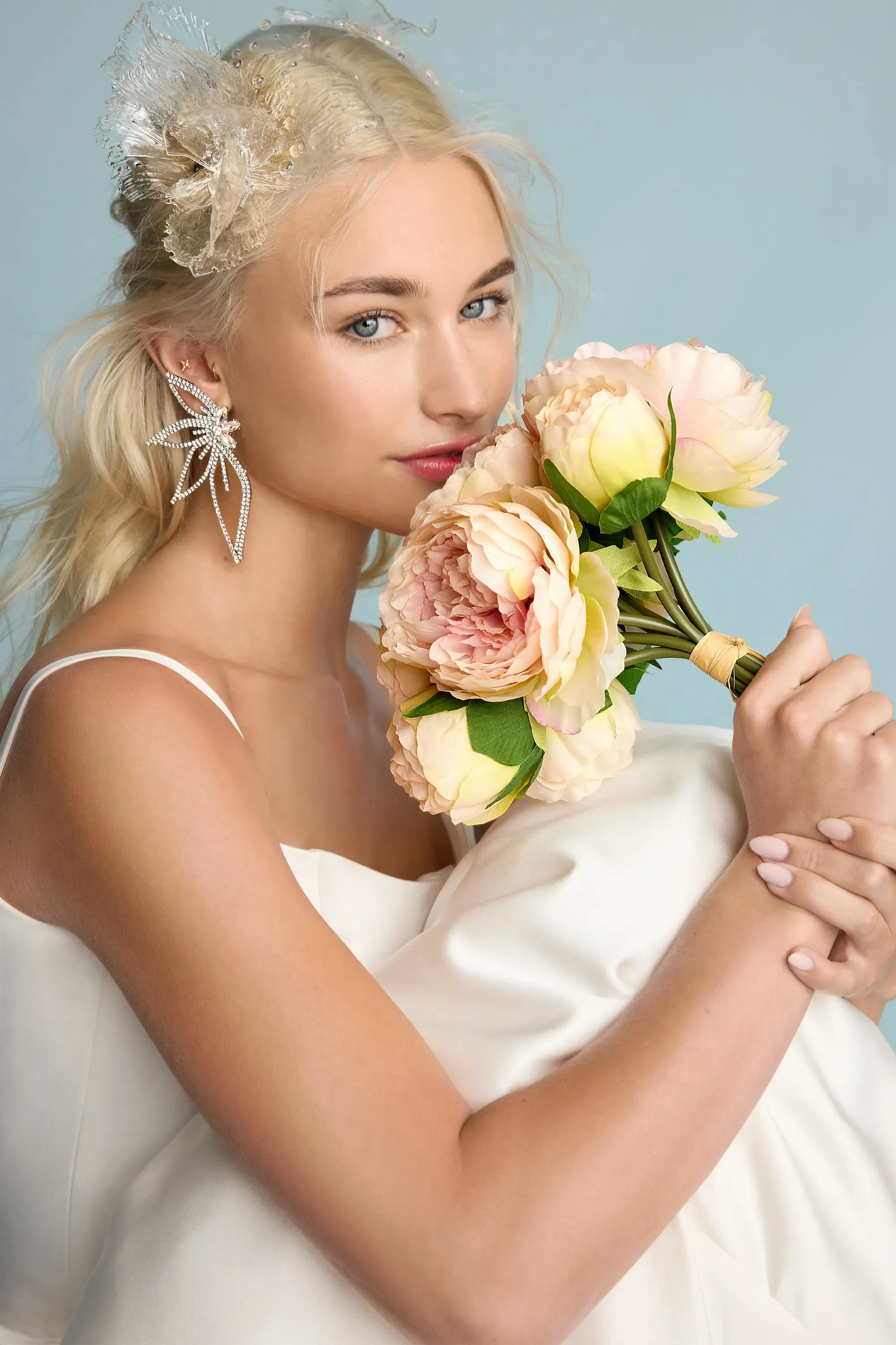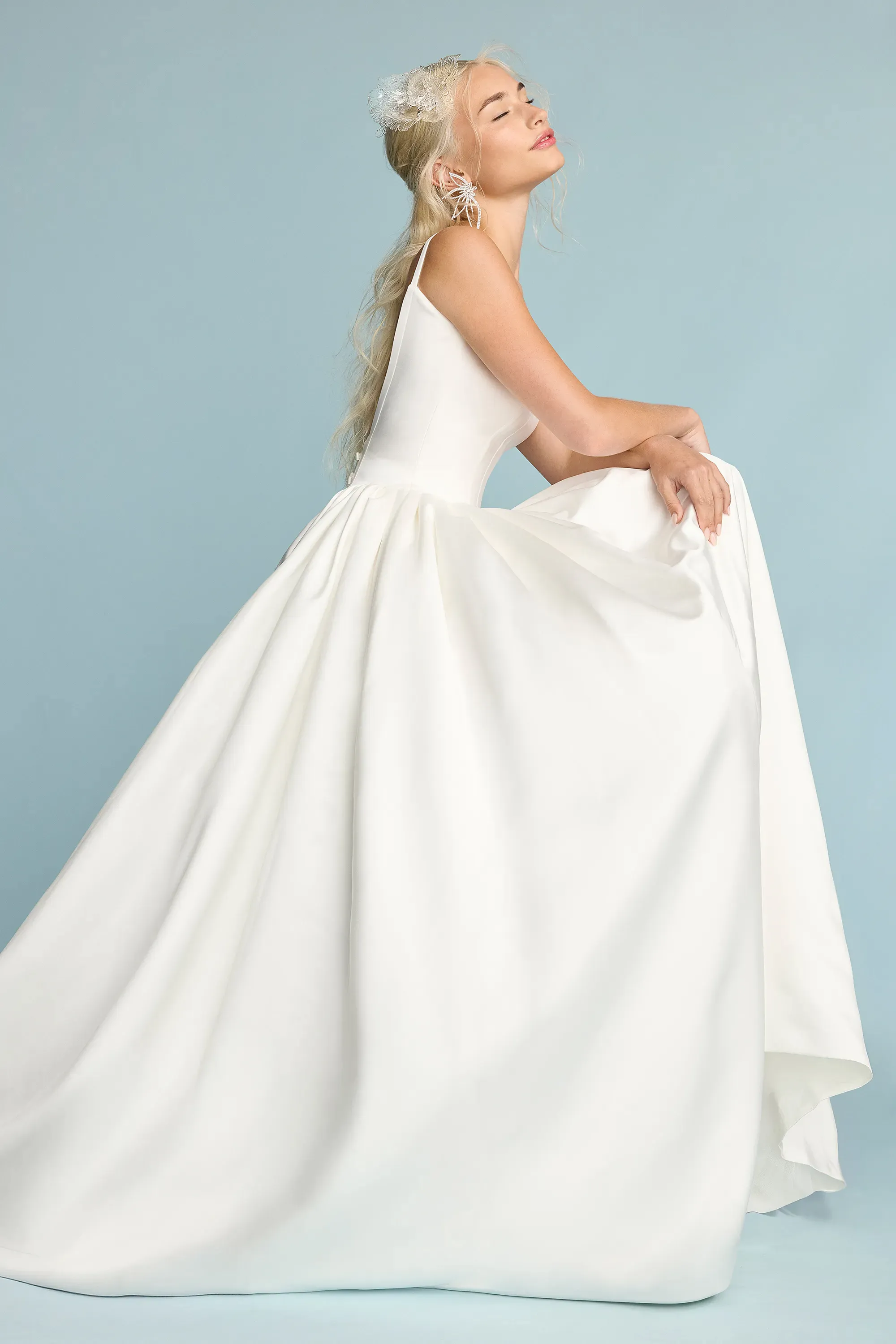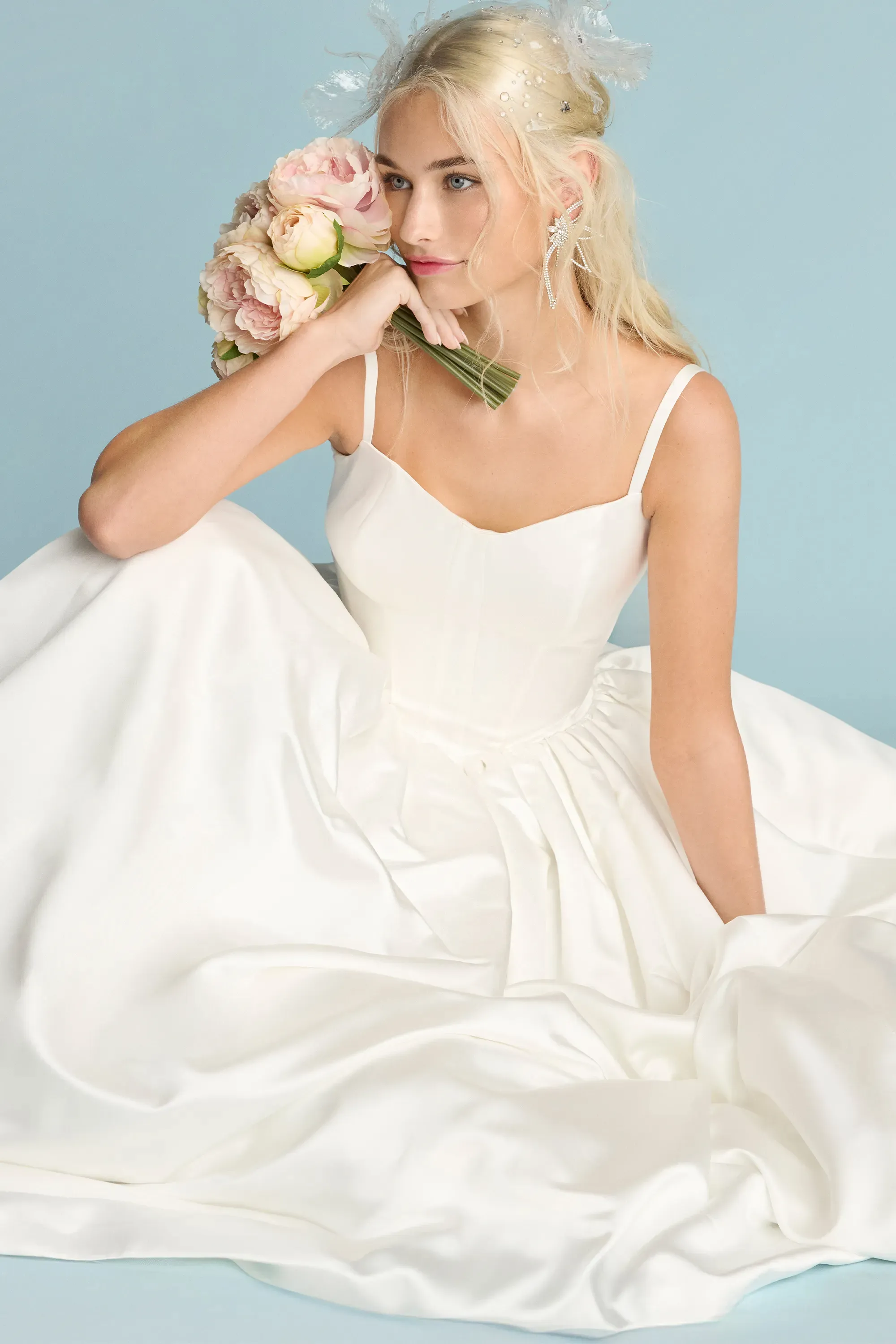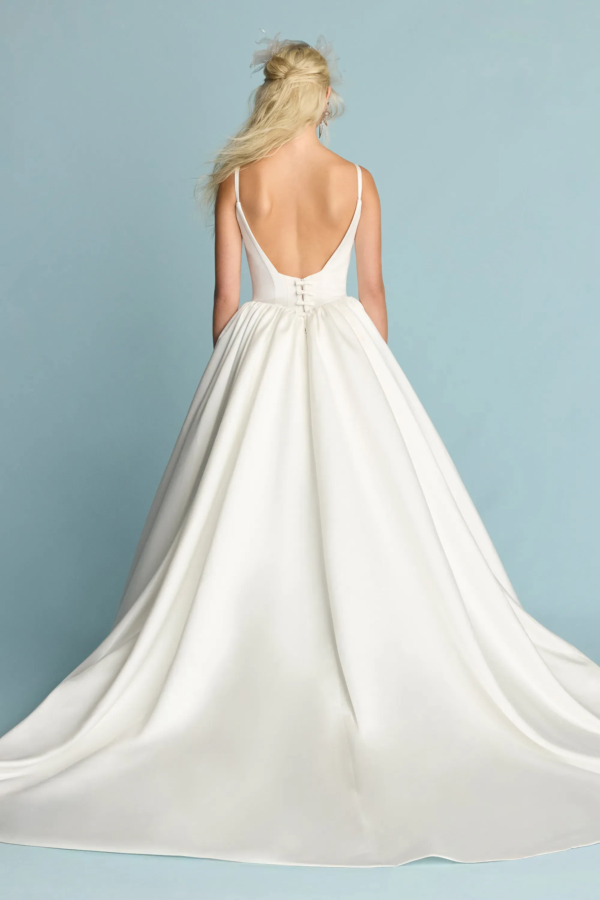 Satin ballgown with dipped neckline and slight basque waist. Finished with micro bows on the lower back.